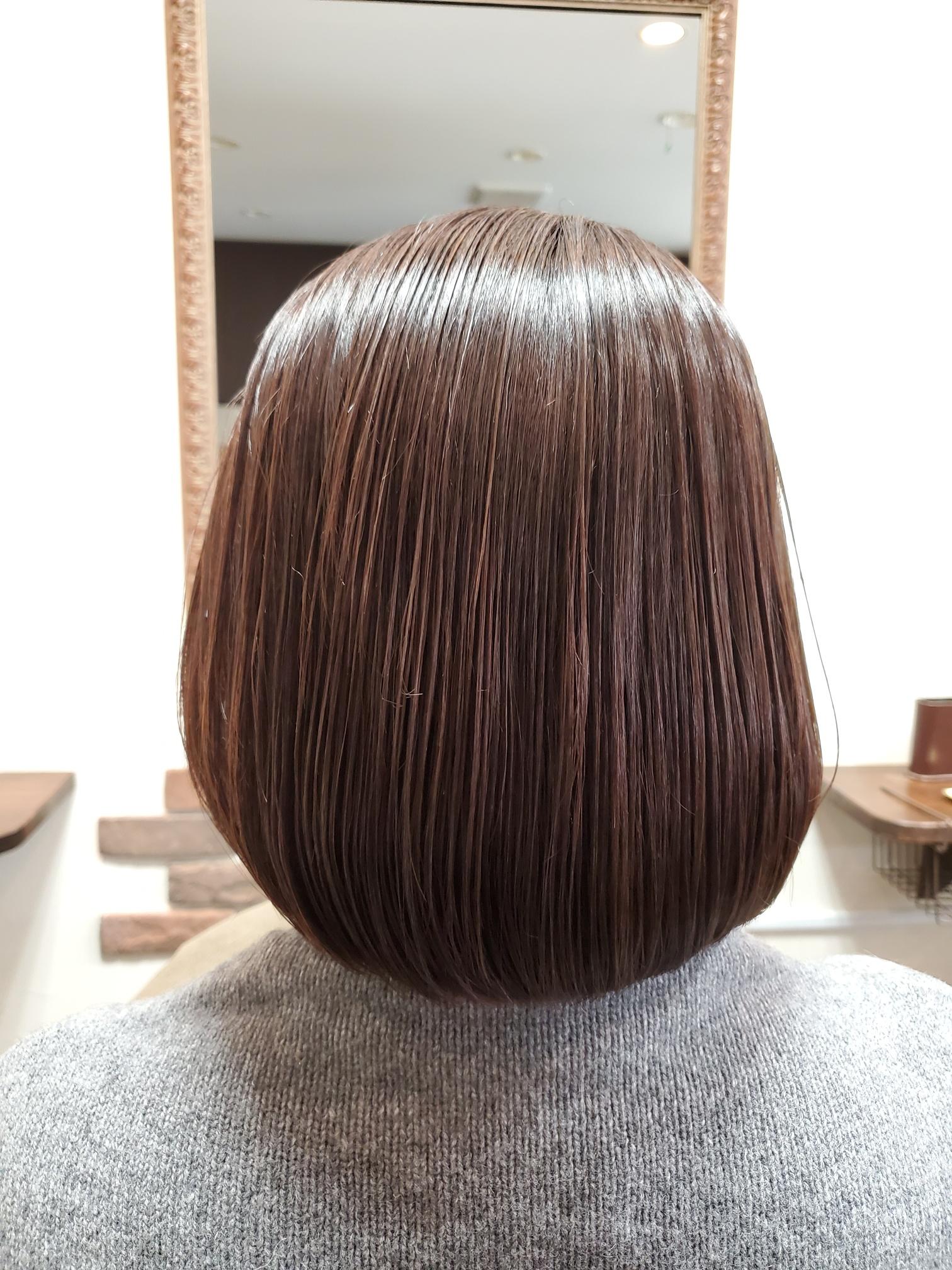 - 襟足すっきりボブスタイル髪の赤みを抑えるフルボ酸カラー髪のチリつき・パサつきを改善するクイックトリートメントお悩み改善して髪の毛もツヤツヤです◎