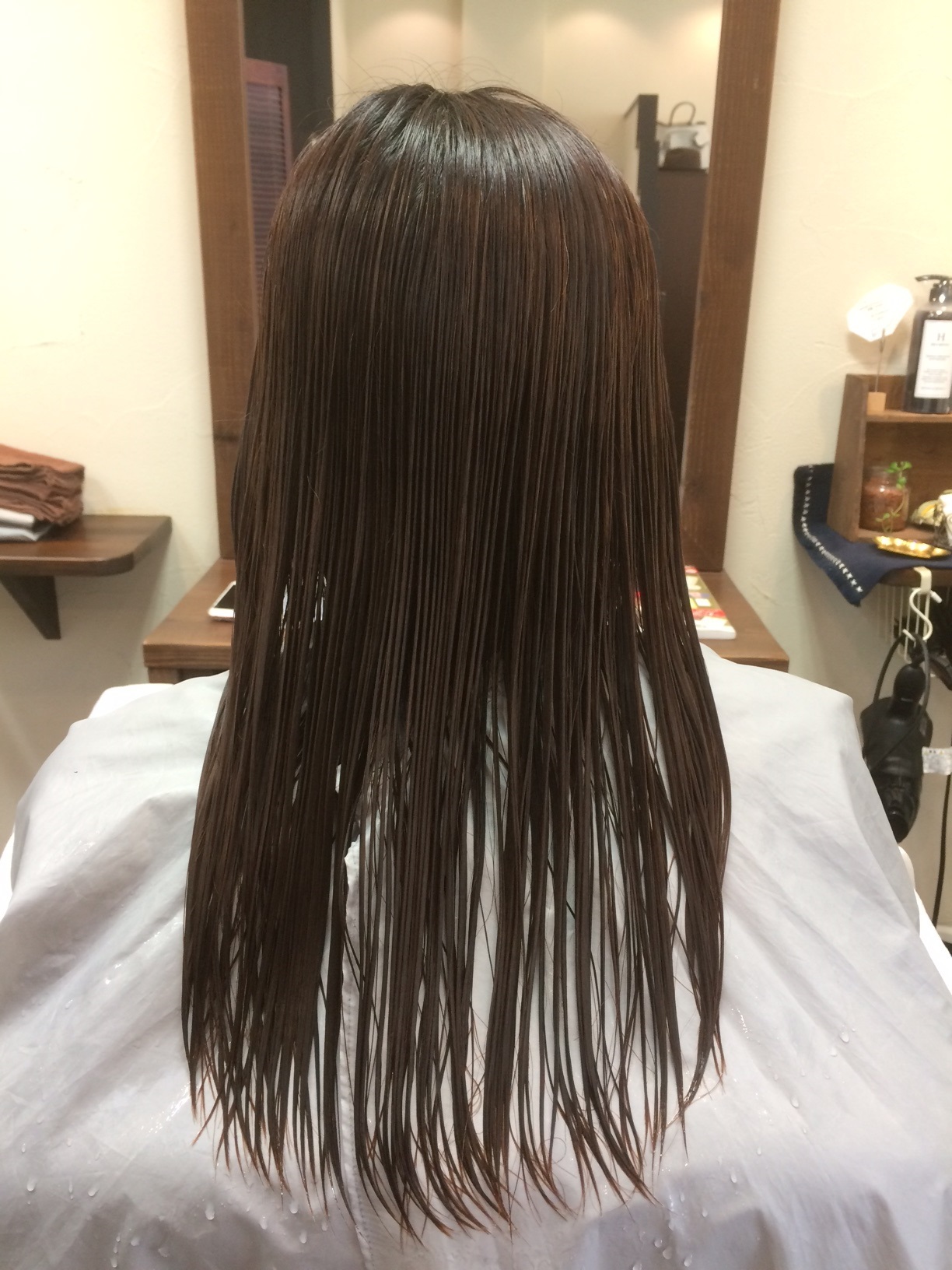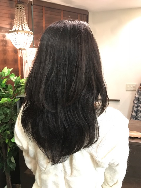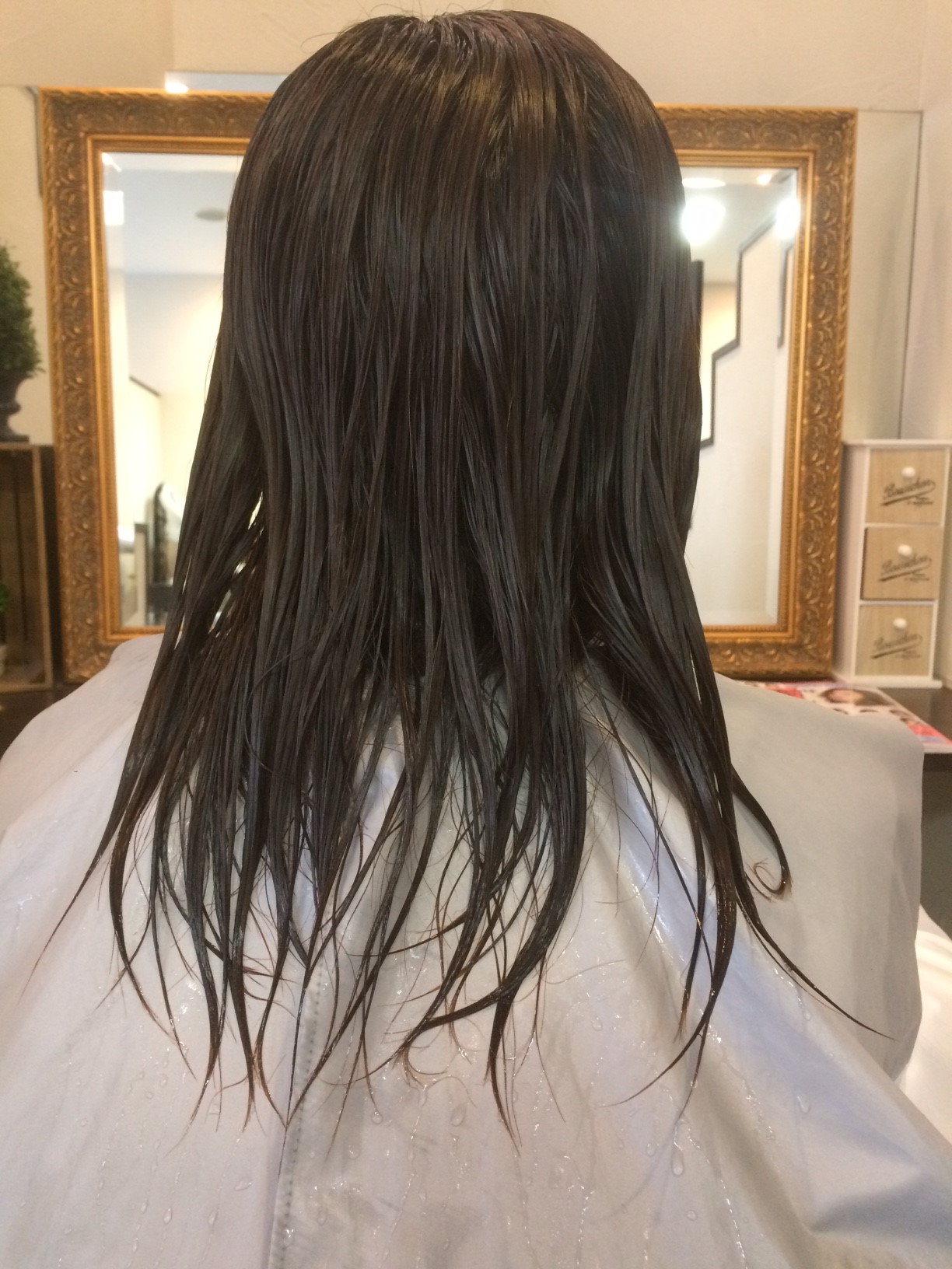 - こんにちは!valoreですいつもはコラーゲン&プロポリストリートメントで施術しておりましたが今回はハナヘナ ナチュラルでトリートメントさせて頂きました。前々回にパーマもかけさせて頂いており、それも若干残っています。パサっとして、髪の毛にゆるみ(髪密度の低下)が感じたのでトリートメントはハナヘナを選択させて頂きました。(お客様の状態によってご提案させて頂いております)春先に向けてトリプルレイヤーでスタイルをカットしますハナヘナナチュラルをトリートメントとしてすると、表面に付いたオレンジ色がシャンプーする度に落ちてきます(3~1週間ほど)。お客様にはお伝えしておりますが、髪の毛が濡れた状態のままですとバスタオルやシャツ、枕カバーにオレンジ色がついてしまう可能性があるので注意して下さいね。(乾いてしまえば大丈夫です)valoreではお客様の状態や悩みに合わせてヘアケアチョイスをさせて頂いております。ヘアケアでお悩みがあるようでしたら是非ご相談下さいしっかりご提案させて頂きます。ありがとうございました!
